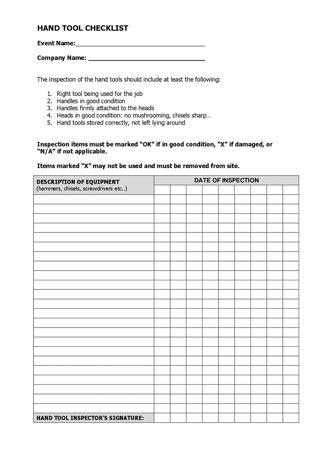 Hand Tool Inspection Checklist Template