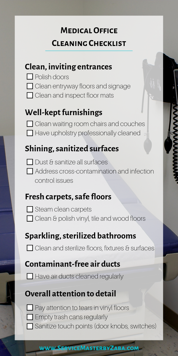 - Deep clean and sanitize all upholstery in waiting areas and examination rooms